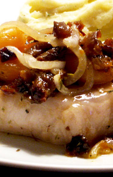 Preheat oven to 220°C. In a casserole dish, combine chardonnay and chicken broth. Mix in the chopped garlic and dried herbs. Add apricots, prunes and sliced onions. Drizzle everything with olive oil then toss. Lie pork chops in the dish, pushing aside the fruit if you need to. Add another drizzle of olive oil and then cover. Bake for 20 to 25 minutes.